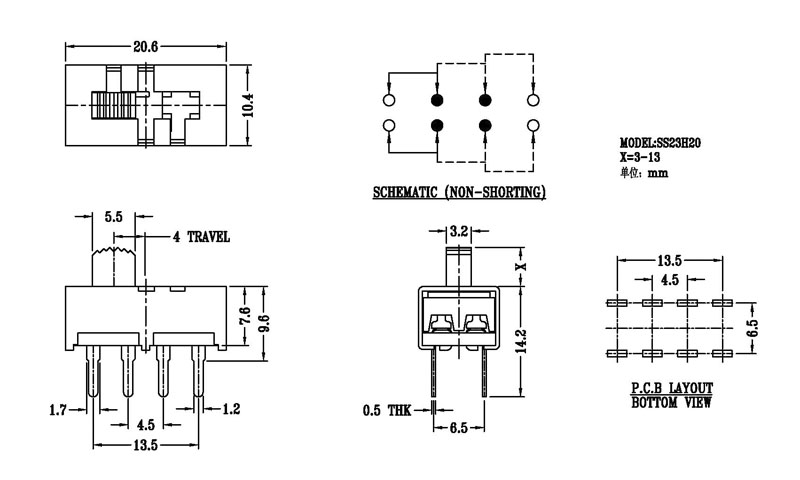 微型撥動開關(guān)技術(shù)參數(shù):